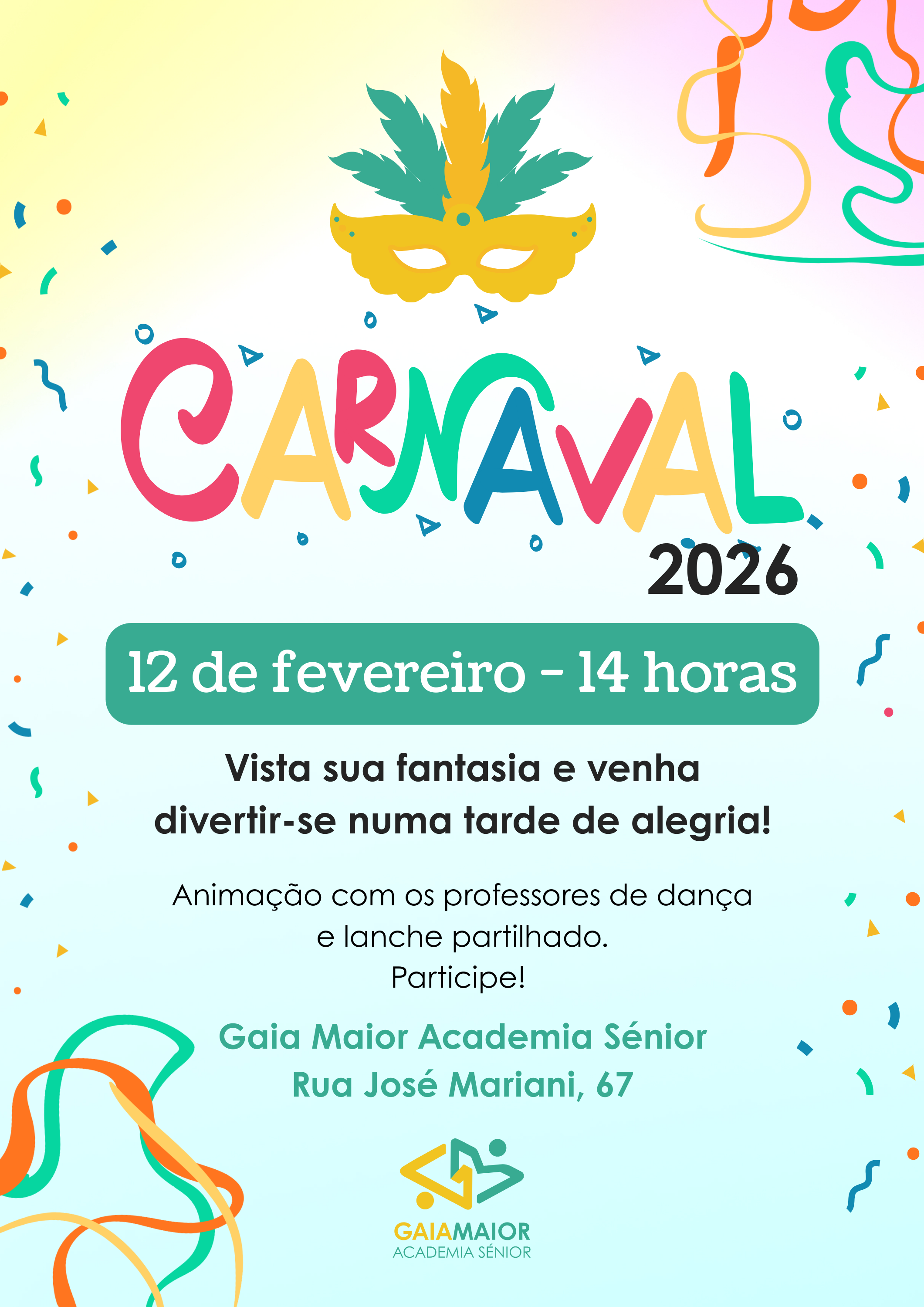 Informamos que no próximo dia 12 de fevereiro (quinta-feira), pelas 14h00, realizar-se-á o nosso Convívio de Carnaval, promovido pela Gaia Maior Academia Sénior.