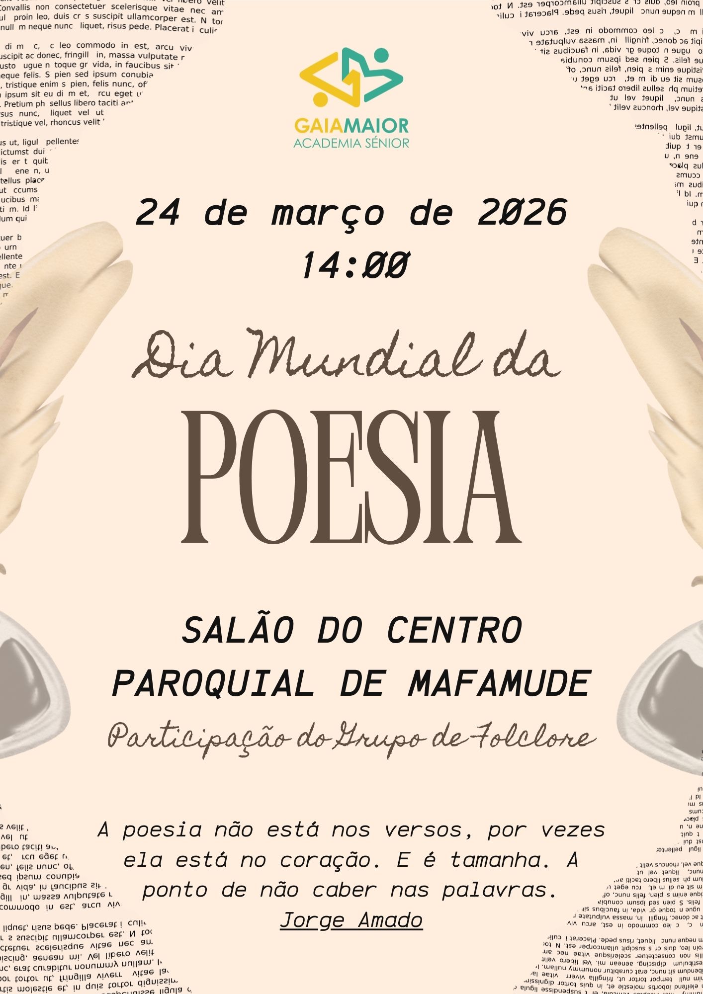 No próximo dia 24 de março, pelas 14h00, no Auditório Paroquial de Mafamude, a Gaia Maior Academia Sénior irá celebrar o Dia Mundial da Poesia.